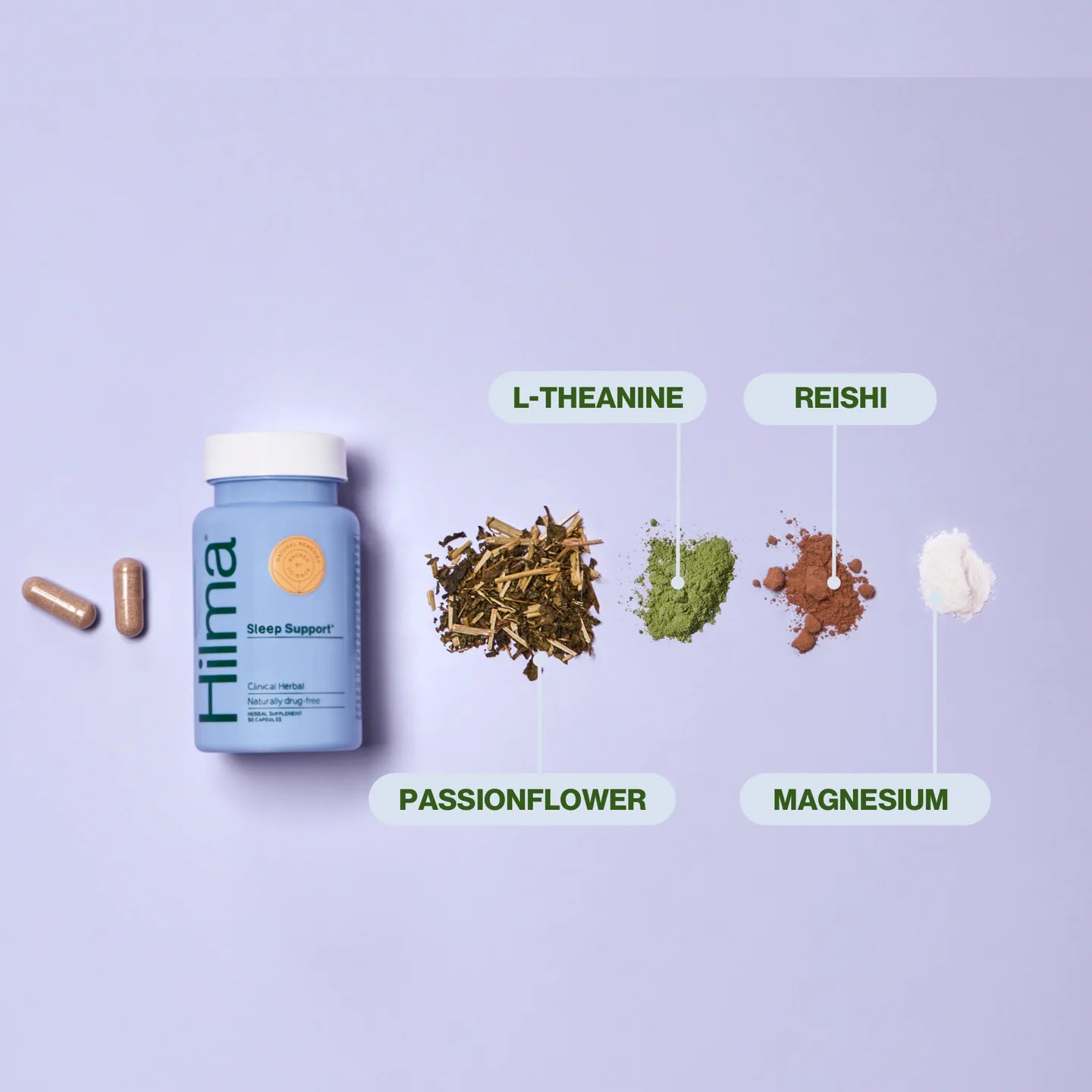 Hilma Sleep Support contains a blend of natural ingredients like melatonin, valerian root, and chamomile that work together to support the body's natural sleep cycle.