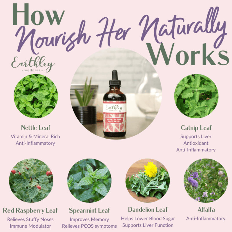 Nourish Her Naturally is a liquid botanical multivitamin formulated for women to strengthen the female body with herbs rich in vitamins and minerals for hormone balance, energy boost, and overall well-being.