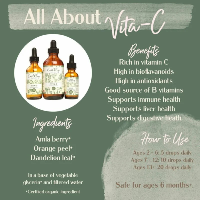 Vita-C tincture is a whole food form of vitamin C, extracted from amla berries, orange peel, and dandelion leaf.